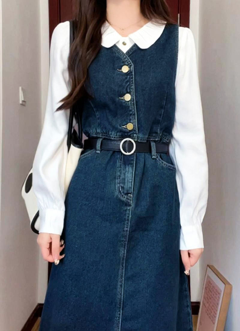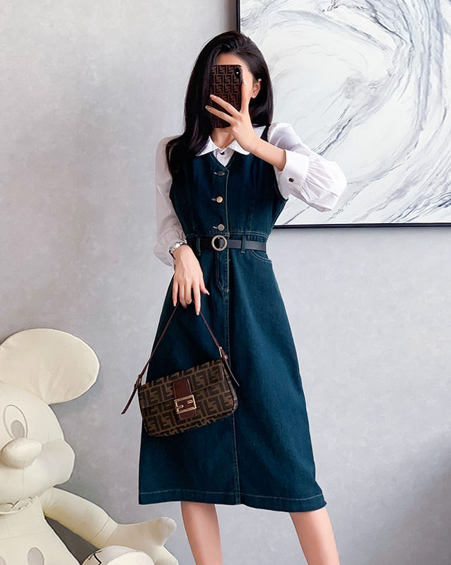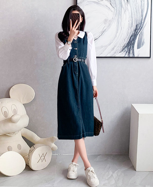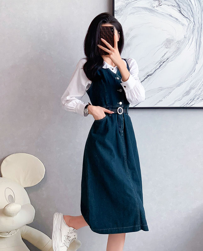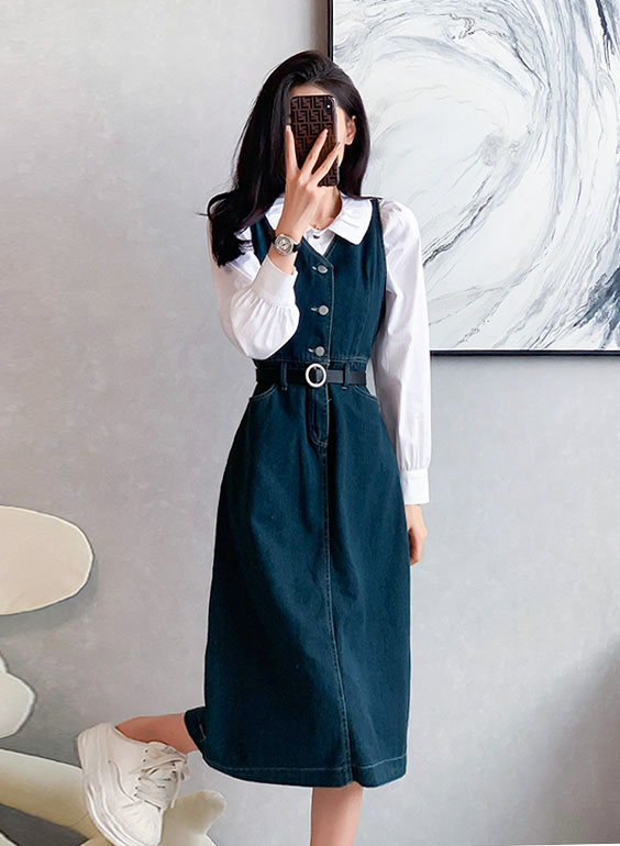 4✮- OTFMY14220 - Denim Midi Dress (Shirt+Denim Pinafore)