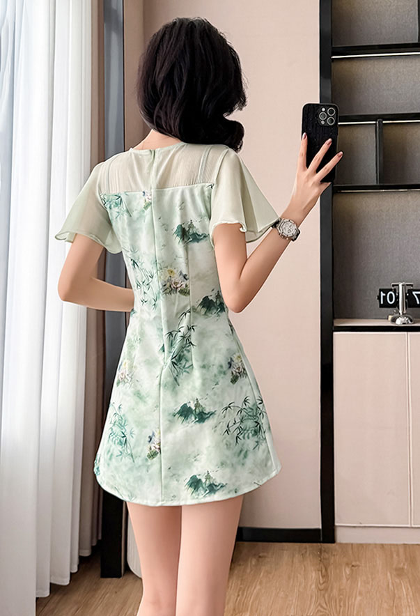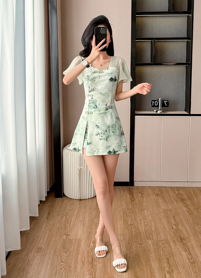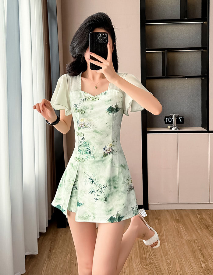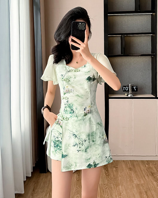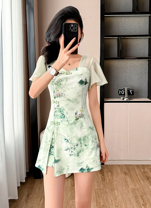 | Feature | SquareVNeckline Dating Cheongsam Irregular Slit BellS DinnerC Girlish FloraM Plus FloralM Pockets Green |
